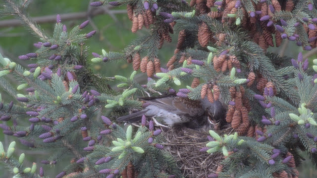 One morning we noticed a bird building a nest. We watched her bring one piece at a time, weaving it in and out of the stuff she already had in the tree. It took her a few days and then she sat in there for a few days and then we had babies!